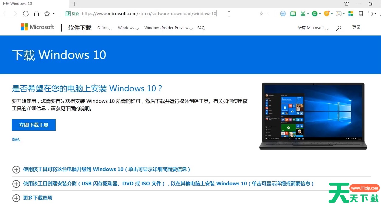 1、打开电脑的浏览器,输入微软官方网址,点击“立即下载工具”。