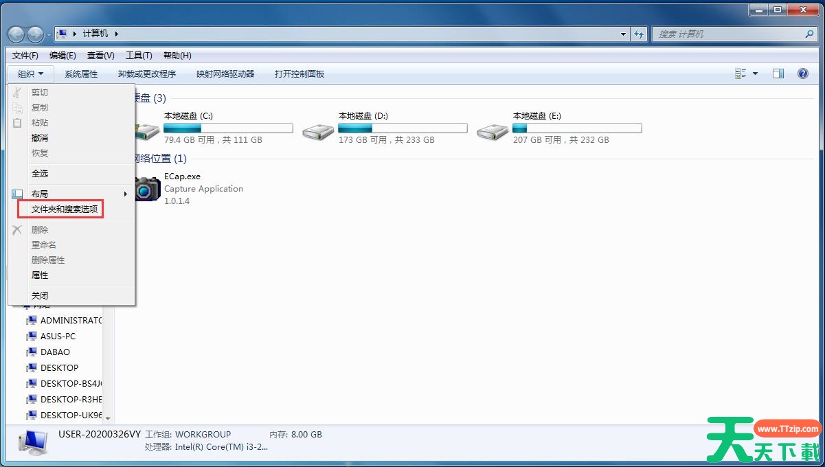 1、首先进入“计算机”,点击左上角的“组织”,在弹出的菜单中打开“文件夹和搜索选项”。