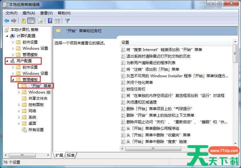 3、在本地组策略中依次展开“用户配置--管理模板--开始菜单和任务栏”。