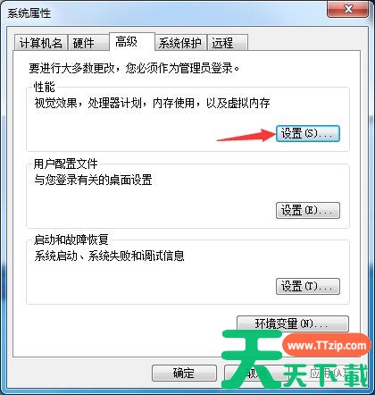 3、接着,在系统属性窗口中,选择“高级”选项卡,其实在上一步已经选择了“高级”选项卡了,无需再做这一步。直接点击“设置”。