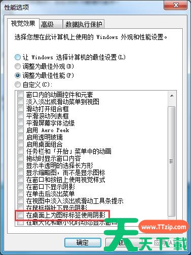 4、就到了最后一步也是最重要的一步了,点击“设置”之后。会进入到“性能选项”的对话框,选择“视觉效果”栏,在众多的效果中找到“在桌面上为图标标签使用阴影”选项,将前面的“√”去掉,点击“确定”即可完成了。
