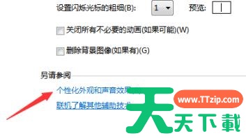 4、之后点击“另请参阅”下的“个性化外观和声音效果”。