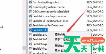 4、右击“EnableLUA”注册表键值点击“修改”。