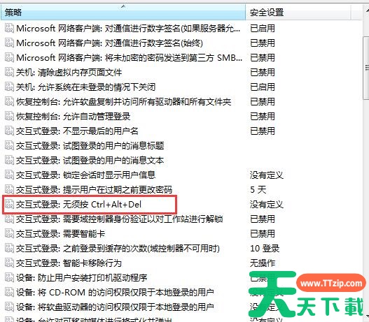 5、双击安全策略后,右边栏显示策略,交互式登陆:无须按ctrl+alt+del;