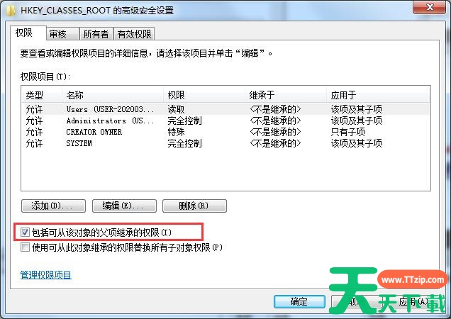 5、在高级权限设置中,我们要去掉勾选“包括可从该对象的父项继承的权限”,然后确定“保存”即可;