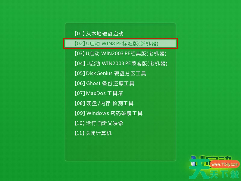 1.进入到u启动主菜单页面,接着移动光标选择“【02】u启动WIN8 PE标准版(新机器)”,按回车键确认,如下图所示: