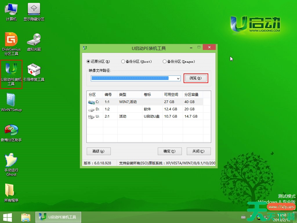 2.登录pe系统后,鼠标左键双击打开桌面上的u启动PE装机工具,然后在工具主窗口中点击“浏览”按钮,如下图所示: