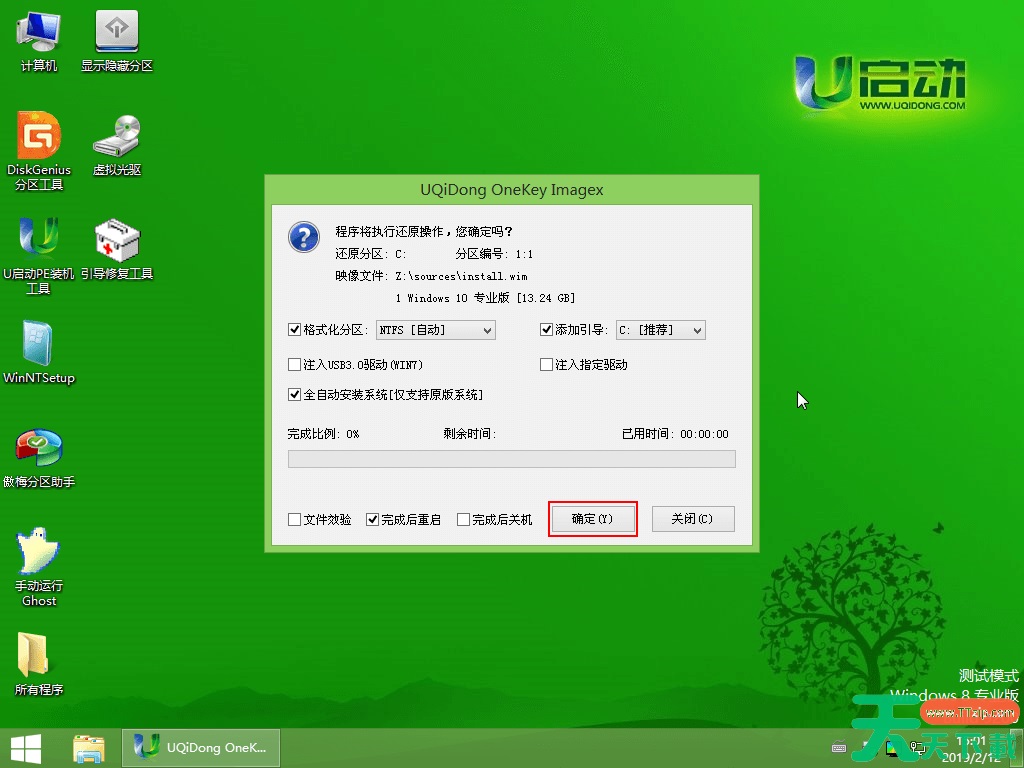 5.此时会弹出一个提示框,询问是否需执行还原操作,在这里建议默认设置,只需点击“确定”即可,如下图所示: