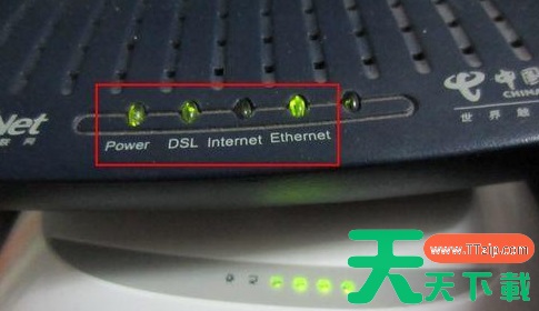 2、检查猫(modem)或路由器的状态指示灯,在上面的就是猫(modem),我们看,正常的是三个指示灯亮的,第一个Power这个就是电源指示灯,第二个DSL就是输出的网线,第四个就是接入的那条电话线,哪个不亮的你就检查哪个。(说明下,如果猫直接接入电脑的,那就是internet灯亮,我这个是接入路由器的,所以是DSL灯亮)