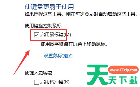 4、在“使键盘更易于使用”窗口,勾选“启用鼠标键”即可。
