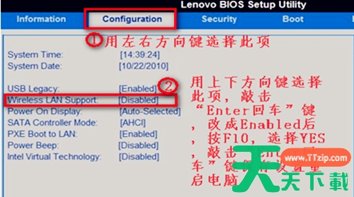 5、重启电脑后,连续按F2键进BIOS,Configuration页面Wireless LAN Support保证是Enabled状态,如果是Disabled状态如图进行更改。