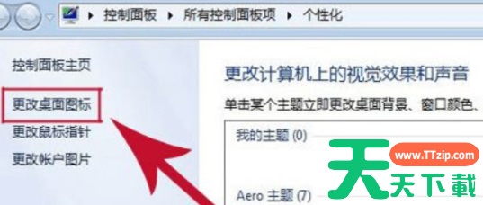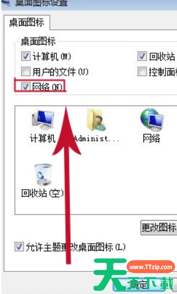 2、在个性化窗口的左侧找到“更改桌面图标”打开。勾选“网络”,点击确定。