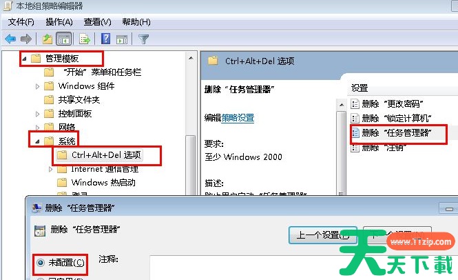1、依次点击“开始-运行”,在运行对话框中输入gpedit.msc打开组策略,然后在组策略中依次展开“用户配置→管理模板→系统→CTRL+ALT+DELE选项”,接着在左侧找到并双击“删除任务管理器”项,将其设置为未配置或者禁用即可。