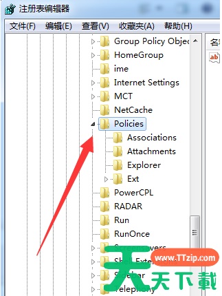 2、进入注册表界面,依次定位到【HKEY_CURRENT_USERSoftwareMicrosoftWindowsCurrentVersionPolicies】项下