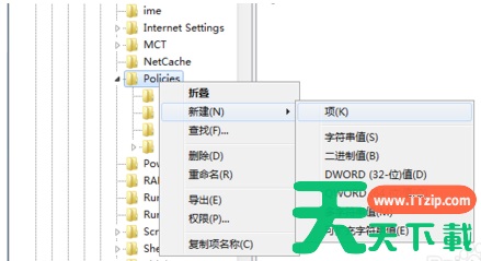 3、右键点击Policies项,选择【新建】,【项】将其命名为 System