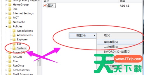 3、接着在System项右方空白区域选择【新建】,【字符串值】将其命名为 DisableTaskMgr