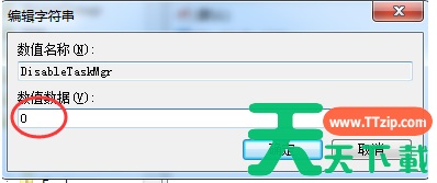 5、双击打开新建的DisableTaskMgr数值,将其数据设置为 0 点击确定。