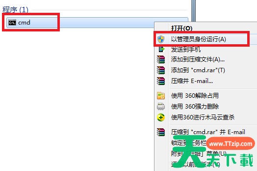 2、右键点击搜索结果中找到CMD程序,选择以管理员身份运行