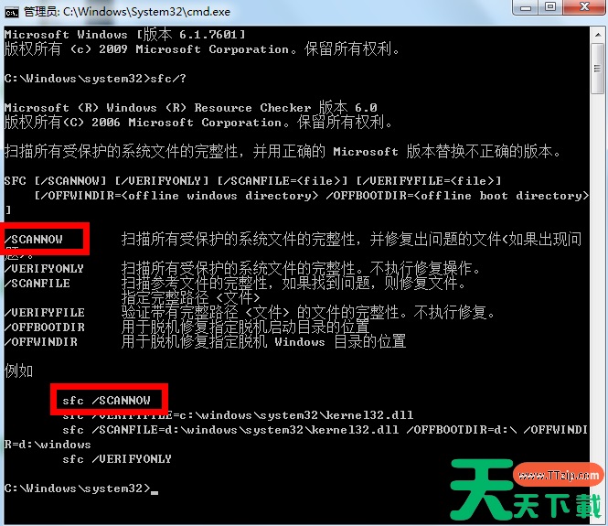 3、调出命令提示符!在命令提示符输入sfc/?后回车对话框将提示你所有的修复命令。