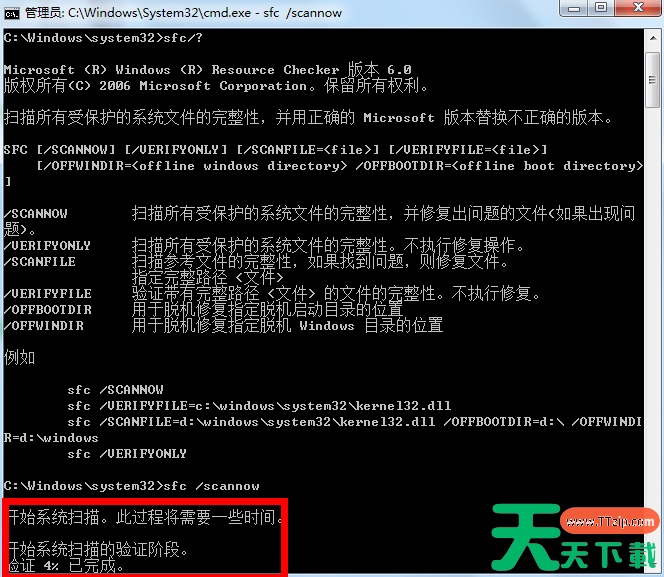 4、在命令窗口输入sfc /scannow回车,执行扫描系统文件并自动修复!等待修复完成即可(整个扫描过程持续时间大概10分钟)