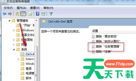 2、依次打开用户设置--管理模板--系统--Ctrl+Alt+Del,双击右侧的“删除‘任务管理器’”打开其属性;
