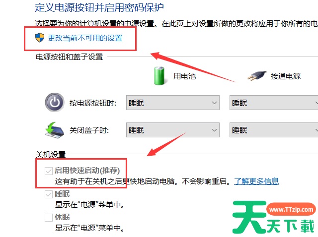 (4)、之前无法选择的选项已经可以更改,可以看到“启用快速启动(推荐)”选项(系统默认开启),可以在此设置是否开启或者关闭此功能。