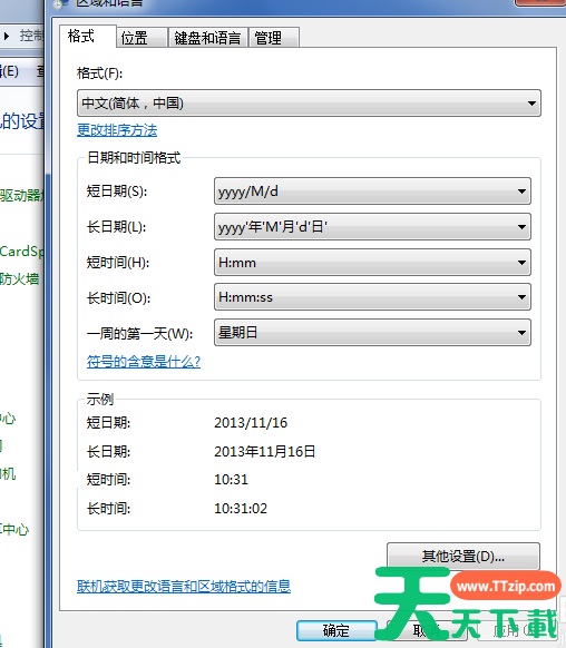 3、点击“区域和语言”后,就打开如下图所示的“区域和语言”设置对话框,默认位于格式选项中