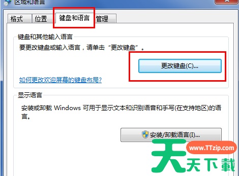 4、点击上面选项卡中的“键盘和语言”,然后在打开的设置页面中点击“更改键盘”,如下图红色方框所示