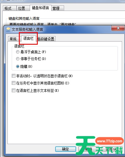 6、在文本服务和输入语言设置对话框上面点选项卡中点击“语言栏”打开设置语言栏的页面,在这里我们可以看到当前语言栏的状态是隐藏的