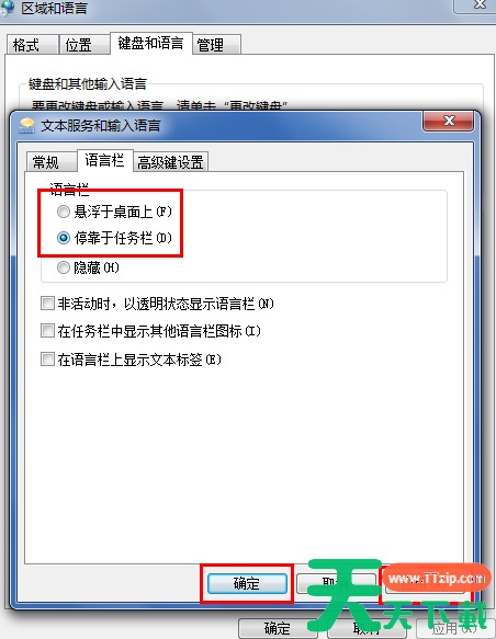 7、将语言栏的状态改为“悬浮于桌面上”或者“停靠于任务栏”,然后点击右下方的“应用”和“确定”按钮,这样就可以看到输入法的图标了