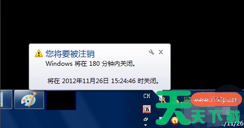 2、点击确定之后,会出现一个短暂的黑色的命令框,继而消失,然后在桌面托盘处显示一个信息,即关机信息,将在多少分钟内关闭。然后这个提示框就会消失。