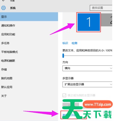 6、分别选择显示器1和显示器2,点击高级显示设置。