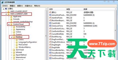 2、展开到“HKEY_CURRENT_USERControlPanelDesktop”;