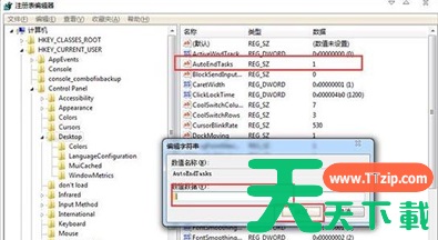 3、在右边找到“AutoEndTasks”双击后,把它的值改为“1”→点击【确定】后将不会在出现关机死机的问题。