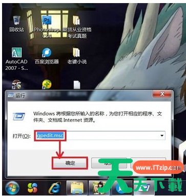 2,在弹出的运行对话框中输入“gpedit.msc”,然后单击“确定”。