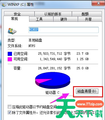 3、选择常规选项卡,在常规选项卡里的磁盘清理。