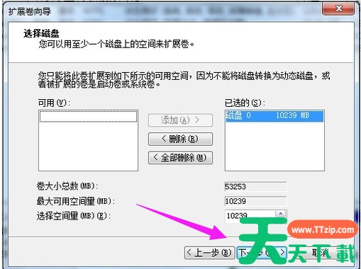 7、如果需要将压缩卷合并到其他的磁盘的话,例如C盘。右击c盘选择“扩展卷”即可执行扩展卷向导窗口,选择可用空间的磁盘,再点击“下一步”。