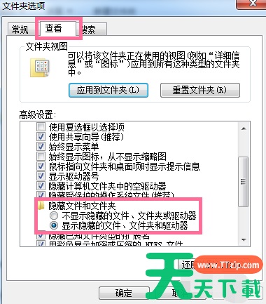 2、点击【查看】,在高级设置下找到【隐藏文件和文件夹】,选择【显示隐藏文件,文件夹和驱动器】。点击确定。