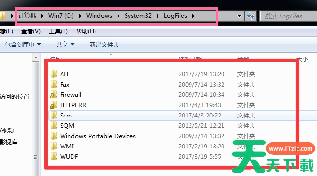 4、删除系统日志和事件日志如图所示路径,C:Windows/System32/LogFiles ,此文件夹里面的可全部直接删除。