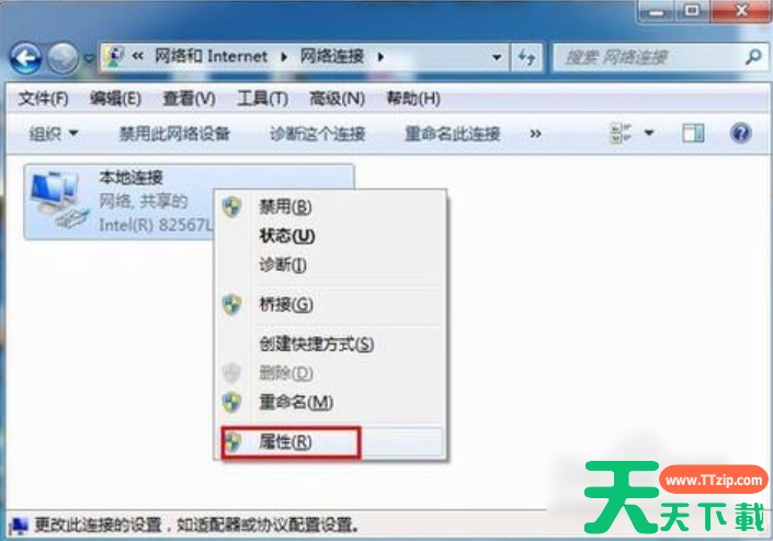 3、接下来,在打开的窗口中,鼠标右键点击“本地连接”,再点“属性”。
