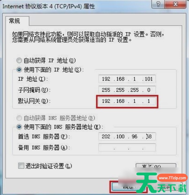 5、然后在打开的“Internet协议版本(TCP/IPv4)属性”里,勾选“使用下面的IP地址”,再输入IP地址和子网掩码,然后再输入默认网关地址,最后点击“确定”即可。