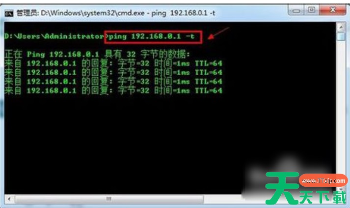 7、打开管理员之后就输入命令“ping 192.168.1.1 -t”(代码可复制),如果信息显示成功接收到数据,就说明默认网关配置成功。