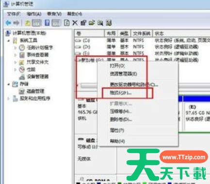 3、右键需要格式化的磁盘,从弹出的菜单中选择格式化。
