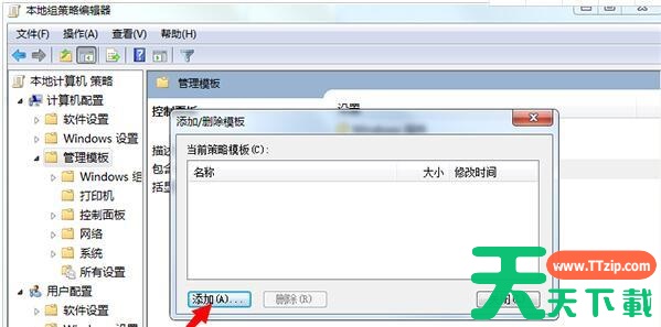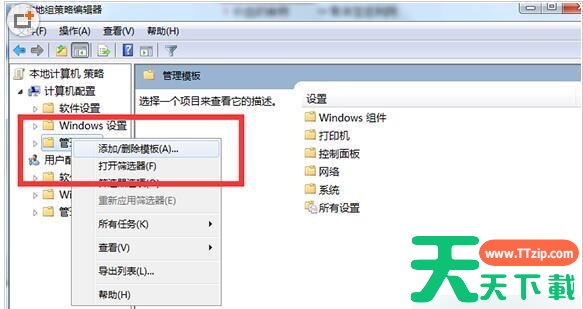 3、进入“本地组策略编辑器”,右键点击【计算机配置】下的【管理模板】,点击【添加或删除模板】;