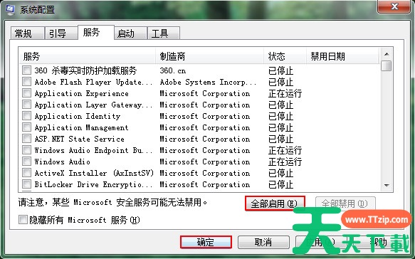 4、重启电脑进行Windows更新,当更新结束后需要恢复第3步禁用的程序,点击“全部启用”即可,如下图所示: