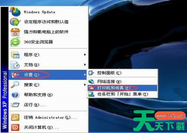 2、在弹出的窗口中,找到并将鼠标移至“设置”选项,但不要点击,在弹出的菜单上找到“打印机和传真”,鼠标左键点击;