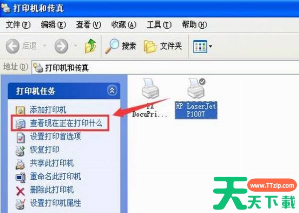3、弹出的窗口如下,找到要寻找的打印机,鼠标左键点击,然后在窗口左边找到“查看现在正在打印什么”选项,并用鼠标左键点击进去;