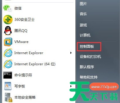 1、在开始菜单,看到“控制面板”选项,鼠标左键点击打开“控制面板”