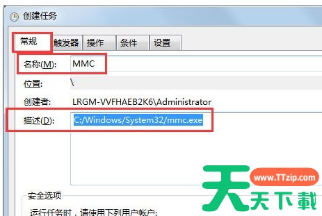 5、在“常规”页面中,把名称编辑为“MMC”,描述处大家可以随意填,但大家要记住填的内容是什么,方便于好找到这个任务;