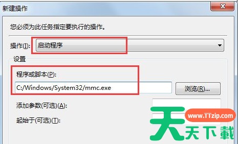 6、上一步确定后,弹出新建操作,在“操作”中调整为“启动程序”,“程序或脚步”处输入地址C:/Windows/System32/mmc.exe,然后确定;